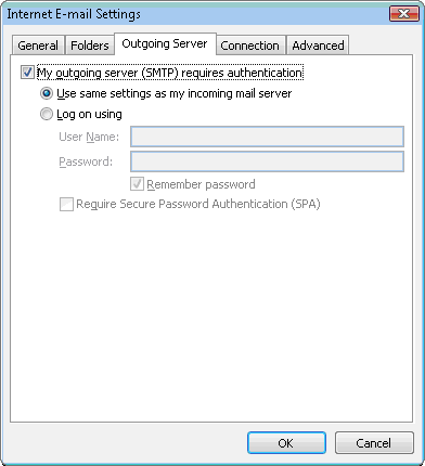 | 11) Click the Outgoing Server tab. Make sure that 'My outgoing server (SMTP) requires authentication' is selected. The radio button 'Use same settings as my incoming mail server' should also be selected. |