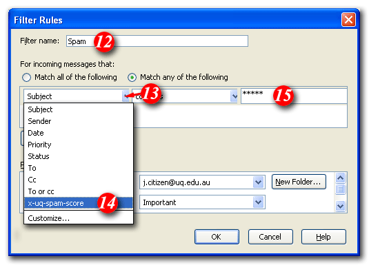 For example, if you wanted to consider anything with a score of 3 or more to be spam, the rule would look like: 'X-SpamDetect: ***'. Decreasing the number of asterisks will result in classifying more e-mails as spam. You may need to check your spam folder more carefully for non-spam e-mails that might have been classified as spam. If you wanted to rate anything with a score of 8 or greater as spam, the rule would look like: 'X-SpamDetect: ********'. Increasing the number of asterisks may result in fewer filtered e-mails being classified as spam and more potential spam staying in your Inbox.